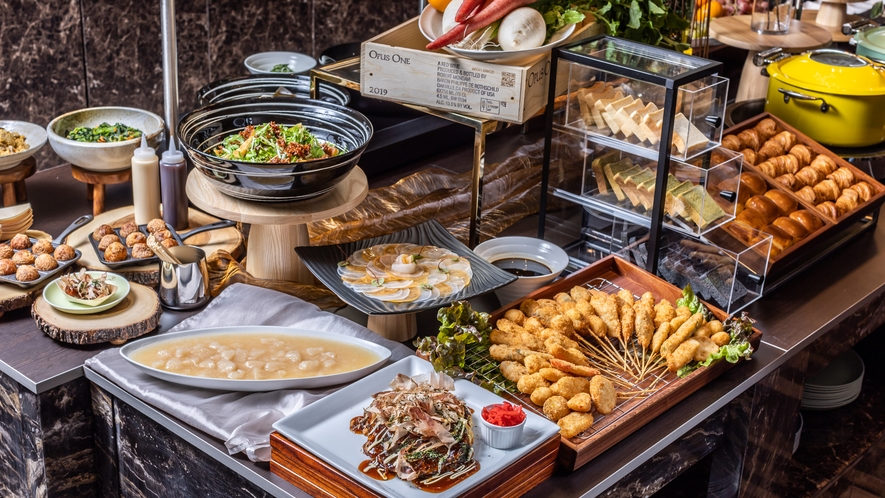 34階の「Orchid time by Osaka Metro」は、朝食のみの営業(6:30〜11:00)ながら、最上階という立地が最大の魅力。串揚げやたこ焼きなど大阪グルメをたっぷり取り入れた和洋創作料理ビュッフェで、旅の朝を贅沢に彩ってくれます。