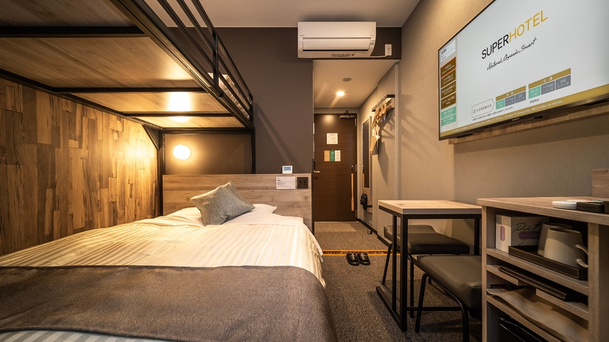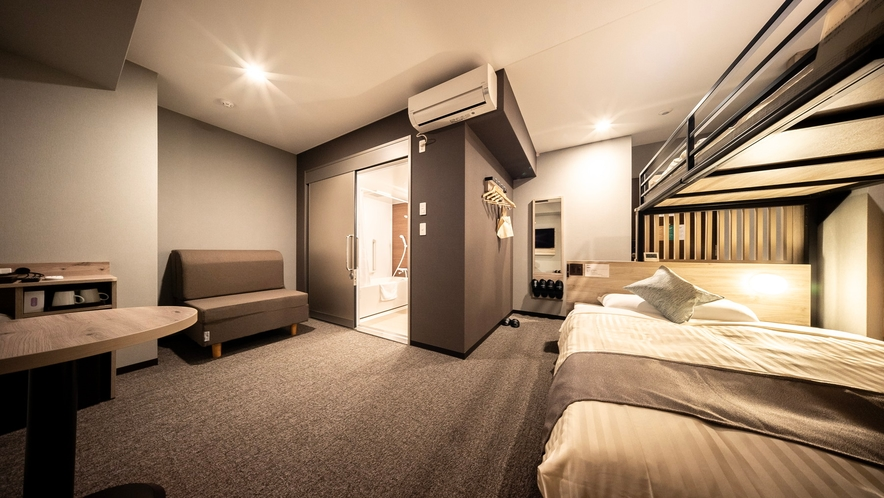 上下ツイン(二段ベッド形式)で、定員1〜3名(幼児含む)に対応した13平米のお部屋。未就学児は添い寝無料(人数カウントはあり)なので、小さいお子さん連れにも対応しています。