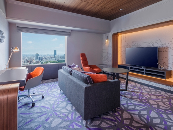 ホテルの高層階、32〜34階に位置するエグゼクティブフロアの客室。スイスの伝統工芸と大阪のエレメントが融合したインテリアで、最先端のアメニティを完備。このグレードに宿泊すると、33階のスイス エグゼクティブ ラウンジが利用可能になります。ラウンジでは朝食ビュッフェからイブニングカクテルまでサービスが充実しており、旅の質がぐっと上がる特別なフロアです。